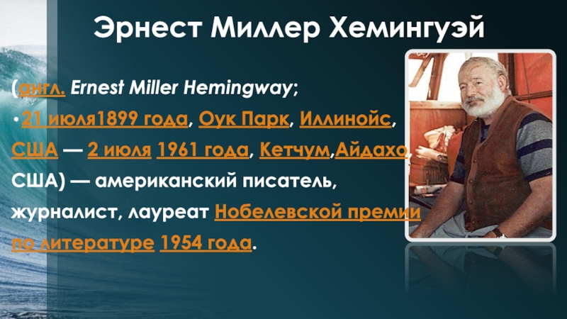 Слайд 2Эрнест Миллер Хемингуэй