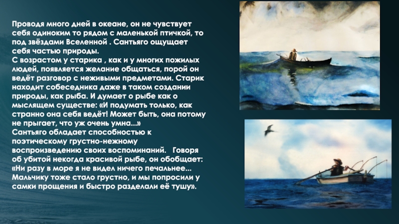 Сантьяго обладает способностью к поэтическому грустно-нежному воспроизведению своих воспоминаний. Говоря об убитой некогда красивой рыбе, он обобщает: «Ни разу в море я не видел ничего печальнее... Мальчику тоже стало грустно, и мы попросили у самки прощения и быстро разделали её тушу».