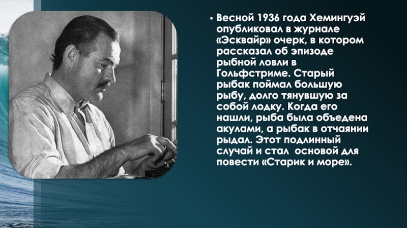 Слайд 12Весной 1936 года Хемингуэй опубликовал в журнале «Эсквайр» очерк, в котором