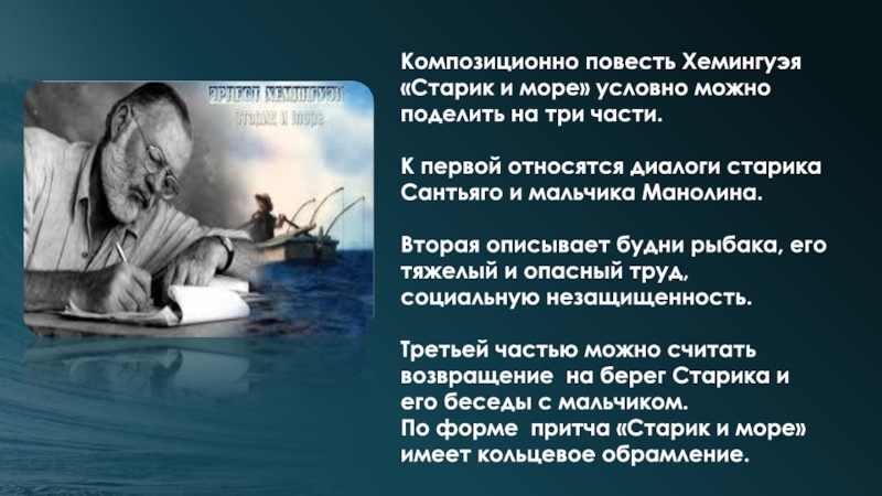 Слайд 14Композиционно повесть Хемингуэя «Старик и море» условно можно поделить на три