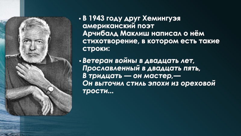 Слайд 6В 1943 году друг Хемингуэя американский поэт