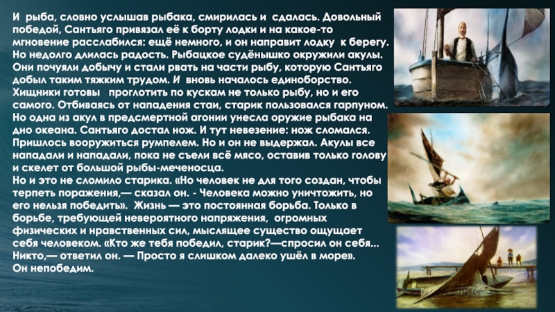 Слайд 21И рыба, словно услышав рыбака, смирилась и сдалась. Довольный победой, Сантьяго