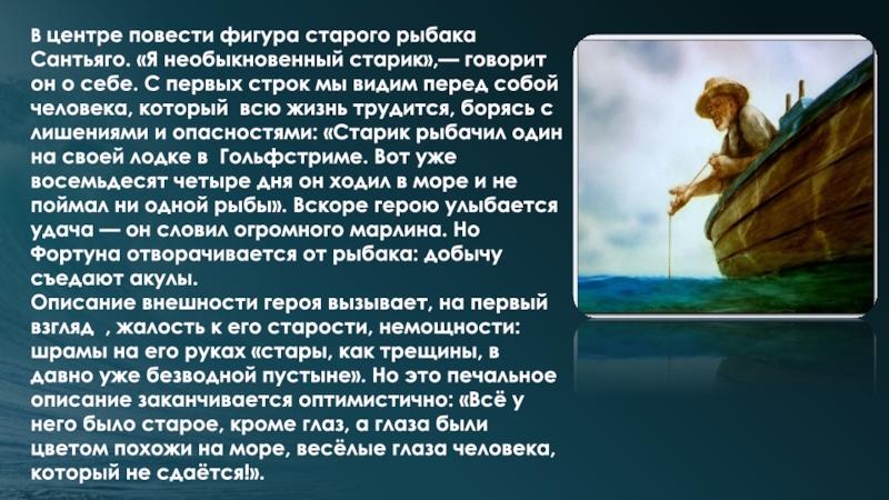 Слайд 15В центре повести фигура старого рыбака Сантьяго. «Я необыкновенный старик»,— говорит