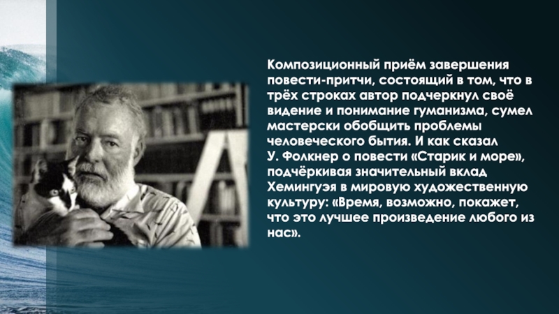 У. Фолкнер о повести «Старик и море», подчёркивая значительный вклад Хемингуэя в мировую художественную культуру: «Время, возможно, покажет, что это лучшее произведение любого из нас».