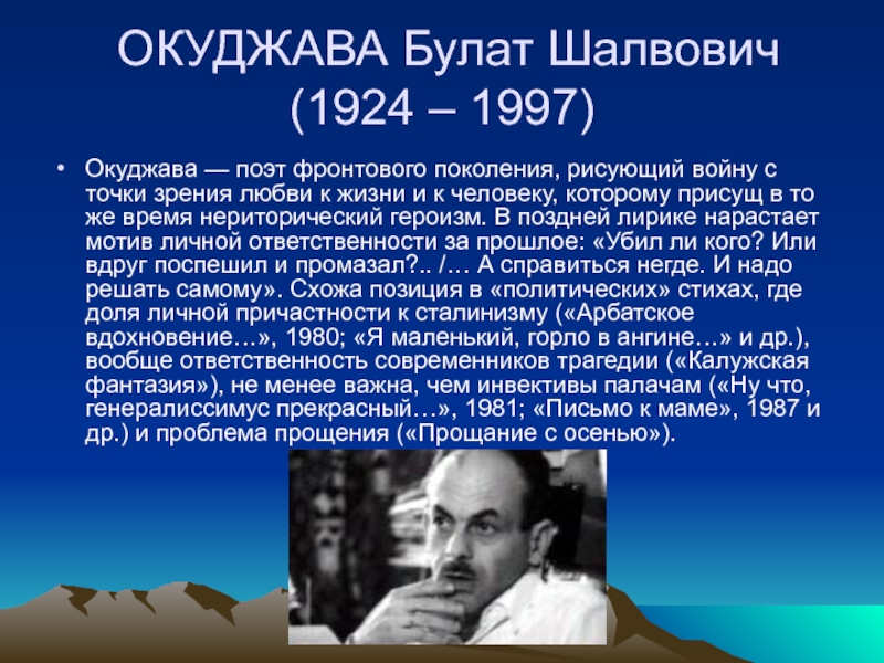 Слайд 12 ОКУДЖАВА Булат Шалвович (1924 – 1997)
