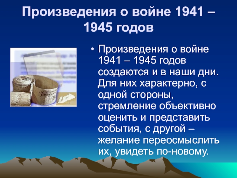 1945 годов создаются и в наши дни. Для них характерно, с одной стороны, стремление объективно оценить и представить события, с другой – желание переосмыслить их, увидеть по-новому.