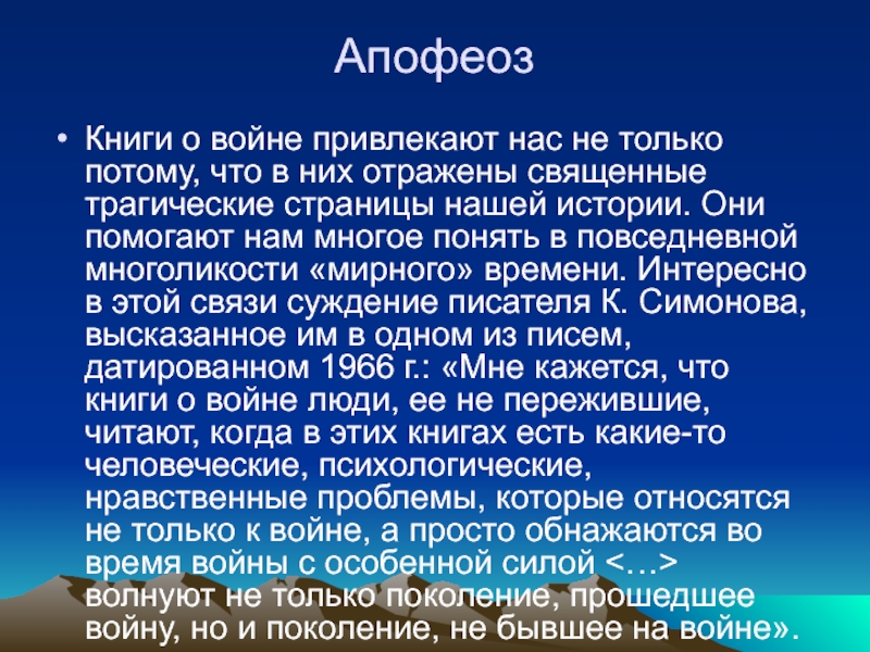 отражены священные трагические страницы нашей истории. Они помогают нам многое понять в повседневной многоликости «мирного» времени. Интересно в этой связи суждение писателя К. Симонова, высказанное им в одном из писем, датированном 1966 г.: «Мне кажется, что книги о войне люди, ее не пережившие, читают, когда в этих книгах есть какие-то человеческие, психологические, нравственные проблемы, которые относятся не только к войне, а просто обнажаются во время войны с особенной силой <…> волнуют не только поколение, прошедшее войну, но и поколение, не бывшее на войне».