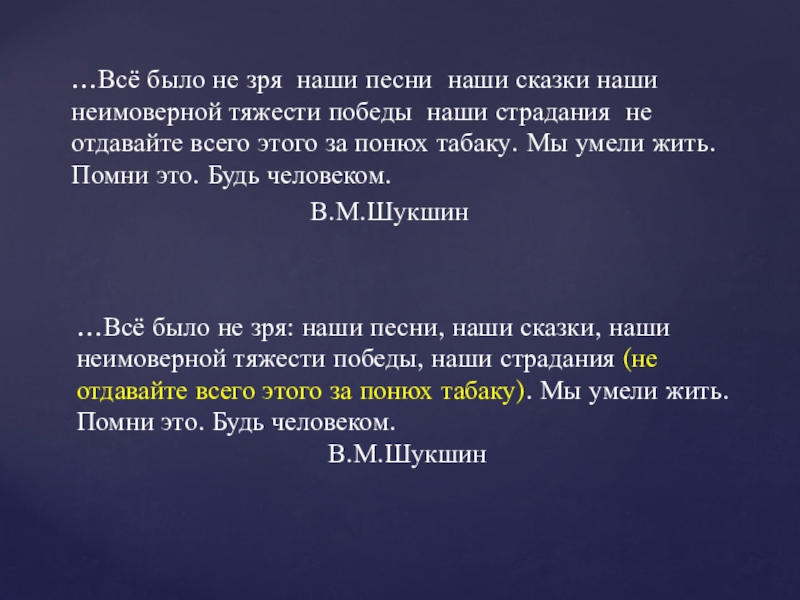 …Всё было не зря: наши песни, наши сказки, наши неимоверной тяжести победы, наши страдания (не отдавайте всего этого за понюх табаку). Мы умели жить. Помни это. Будь человеком.
