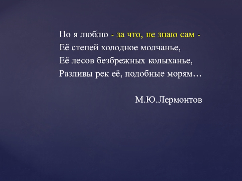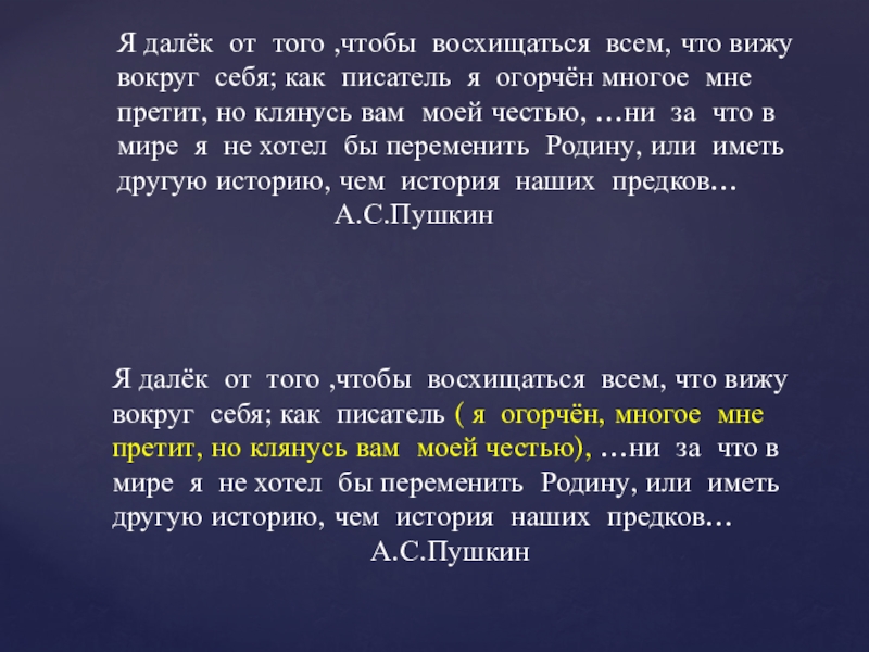 Я далёк от того ,чтобы восхищаться всем, что вижу вокруг себя; как писатель я огорчён многое мне претит, но клянусь вам моей честью, …ни за что в мире я не хотел бы переменить Родину, или иметь другую историю, чем история наших предков…