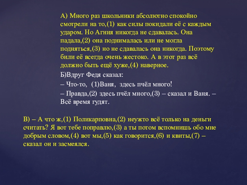 В) – А что ж,(1) Поликарповна,(2) неужто всё только на деньги считать? Я вот тебе поправлю,(3) а ты потом вспомнишь обо мне добрым словом,(4) вот мы,(5) как говорится,(6) и квиты,(7) – сказал он и засмеялся.