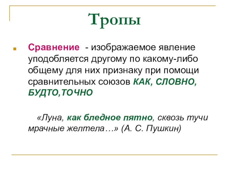 Сравнение - изображаемое явление уподобляется другому по какому-либо общему для них