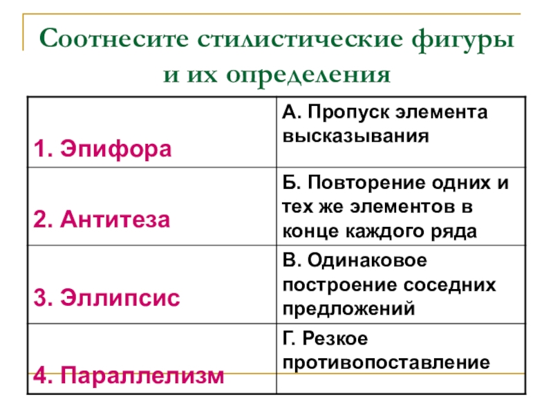 Слайд 25Соотнесите стилистические фигуры и их определения