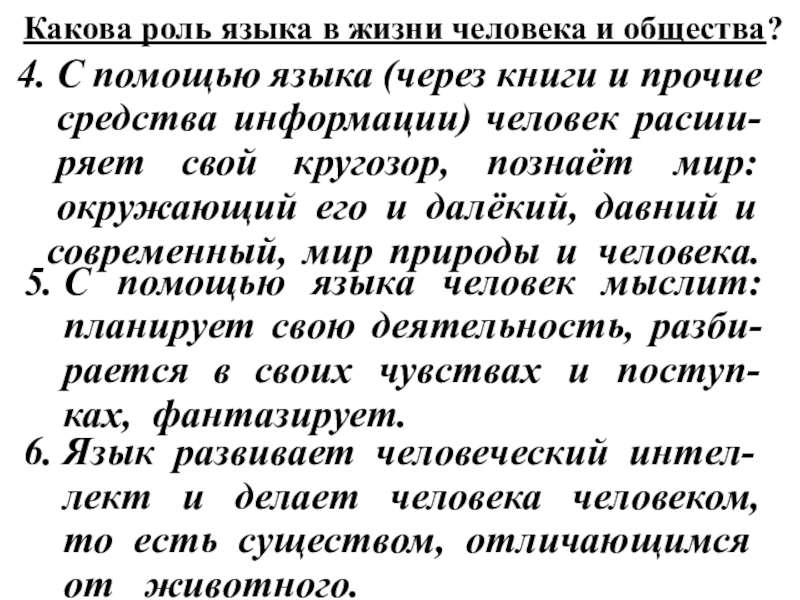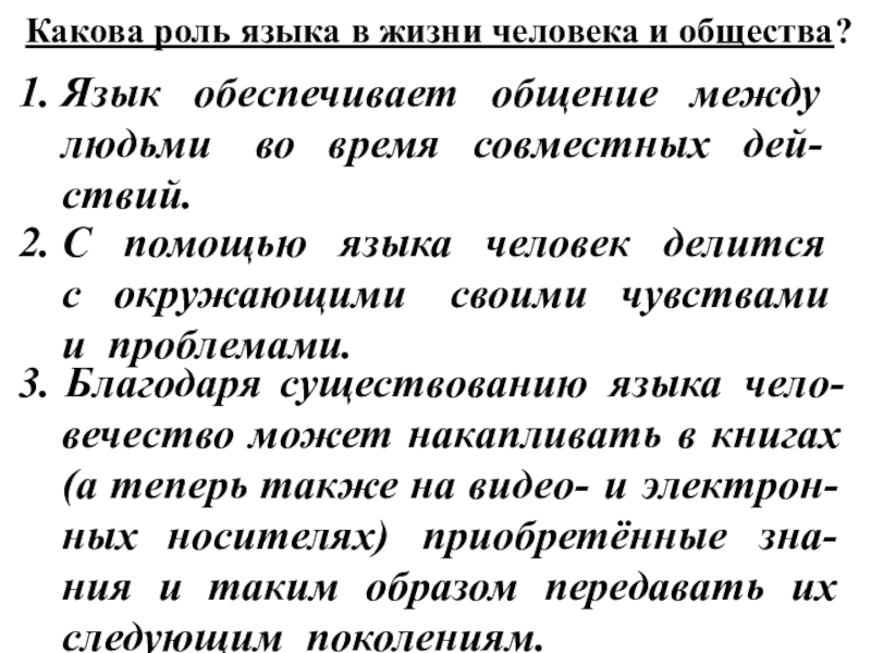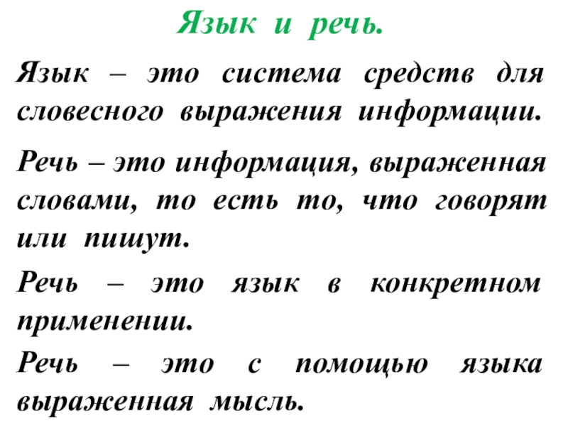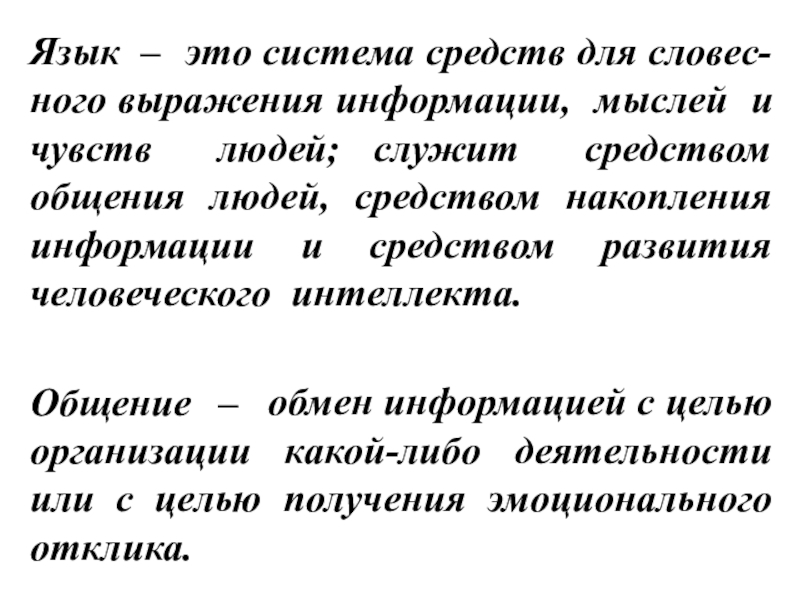 это система средств для словес-ного выражения информации, мыслей и чувств людей; служит средством общения людей, средством накопления информации и средством развития человеческого интеллекта.
