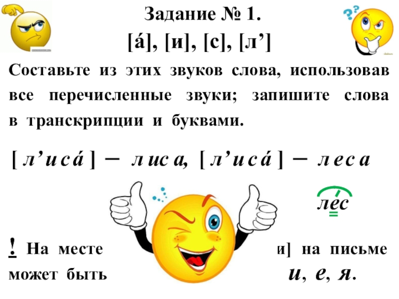 Составьте из этих звуков слова, использовав все перечисленные звуки; запишите слова в транскрипции и буквами.