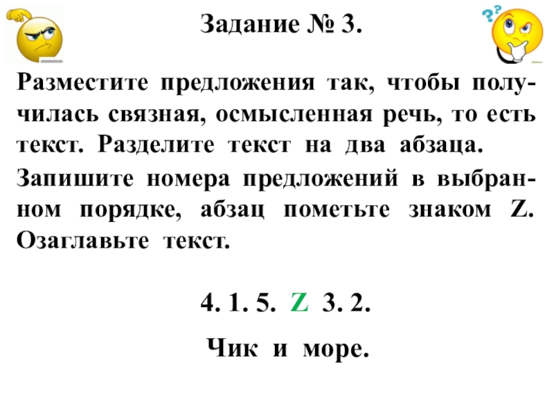 Запишите номера предложений в выбран-ном порядке, абзац пометьте знаком Z. Озаглавьте текст.