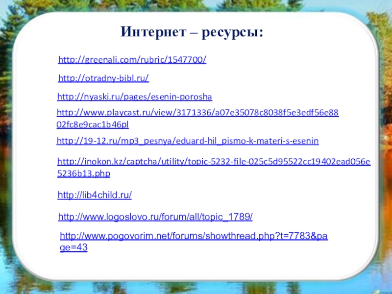 http://greenali.com/rubric/1547700/ http://nyaski.ru/pages/esenin-porosha http://www.playcast.ru/view/3171336/a07e35078c8038f5e3edf56e8802fc8e9cac1b46pl http://19-12.ru/mp3_pesnya/eduard-hil_pismo-k-materi-s-esenin http://inokon.kz/captcha/utility/topic-5232-file-025c5d95522cc19402ead056e5236b13.php http://otradny-bibl.ru/ Интернет – ресурсы:http://lib4child.ru/ http://www.logoslovo.ru/forum/all/topic_1789/ http://www.pogovorim.net/forums/showthread.php?t=7783&page=43