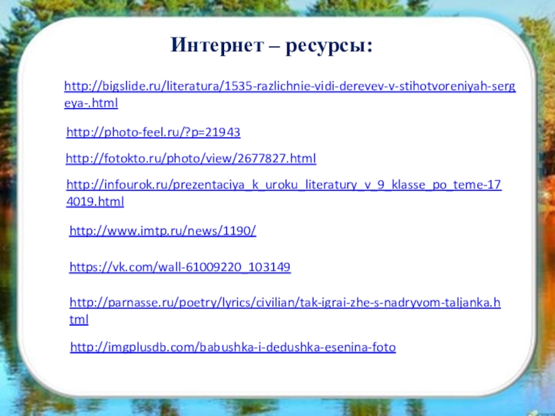 http://www.imtp.ru/news/1190/ http://parnasse.ru/poetry/lyrics/civilian/tak-igrai-zhe-s-nadryvom-taljanka.html http://photo-feel.ru/?p=21943 http://infourok.ru/prezentaciya_k_uroku_literatury_v_9_klasse_po_teme-174019.html http://imgplusdb.com/babushka-i-dedushka-esenina-foto https://vk.com/wall-61009220_103149 http://bigslide.ru/literatura/1535-razlichnie-vidi-derevev-v-stihotvoreniyah-sergeya-.html http://fotokto.ru/photo/view/2677827.html Интернет – ресурсы: