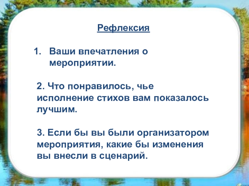 РефлексияВаши впечатления о мероприятии.2. Что понравилось, чье исполнение стихов вам показалось лучшим.3. Если бы вы были организатором