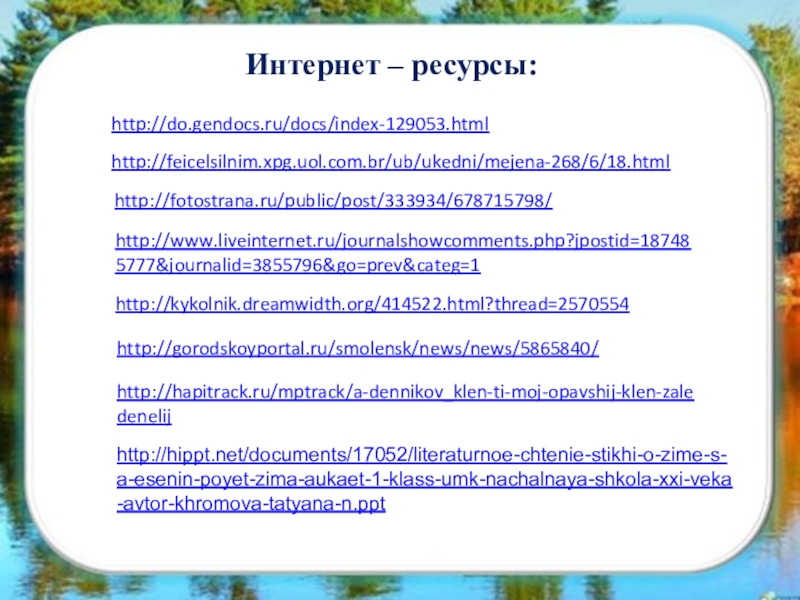 http://fotostrana.ru/public/post/333934/678715798/ http://feicelsilnim.xpg.uol.com.br/ub/ukedni/mejena-268/6/18.html http://www.liveinternet.ru/journalshowcomments.php?jpostid=187485777&journalid=3855796&go=prev&categ=1 http://do.gendocs.ru/docs/index-129053.html http://kykolnik.dreamwidth.org/414522.html?thread=2570554 http://gorodskoyportal.ru/smolensk/news/news/5865840/ Интернет – ресурсы:http://hapitrack.ru/mptrack/a-dennikov_klen-ti-moj-opavshij-klen-zaledenelij http://hippt.net/documents/17052/literaturnoe-chtenie-stikhi-o-zime-s-a-esenin-poyet-zima-aukaet-1-klass-umk-nachalnaya-shkola-xxi-veka-avtor-khromova-tatyana-n.ppt