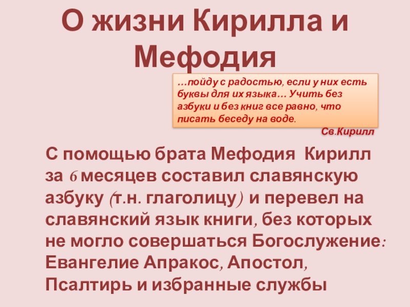 …пойду с радостью, если у них есть буквы для их языка… Учить без азбуки и без книг все равно, что писать беседу на воде.