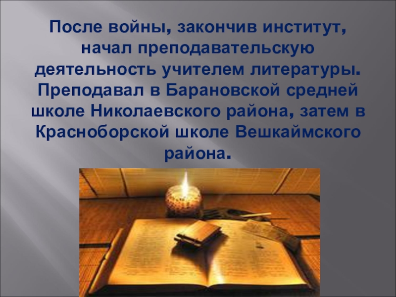 Слайд 8 После войны, закончив институт, начал преподавательскую деятельность учителем литературы. Преподавал в Барановской