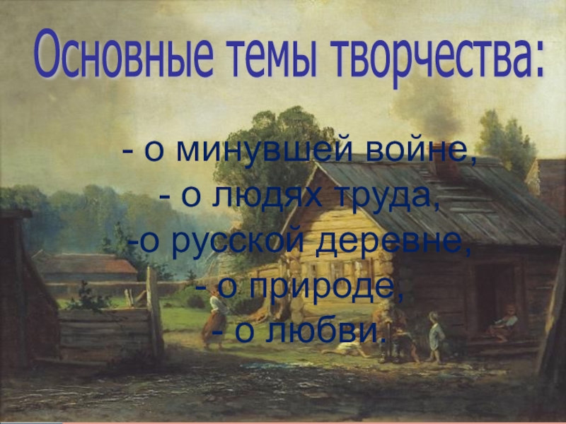 Основные темы творчества: - о минувшей войне, - о людях труда, -о русской деревне, - о природе,
