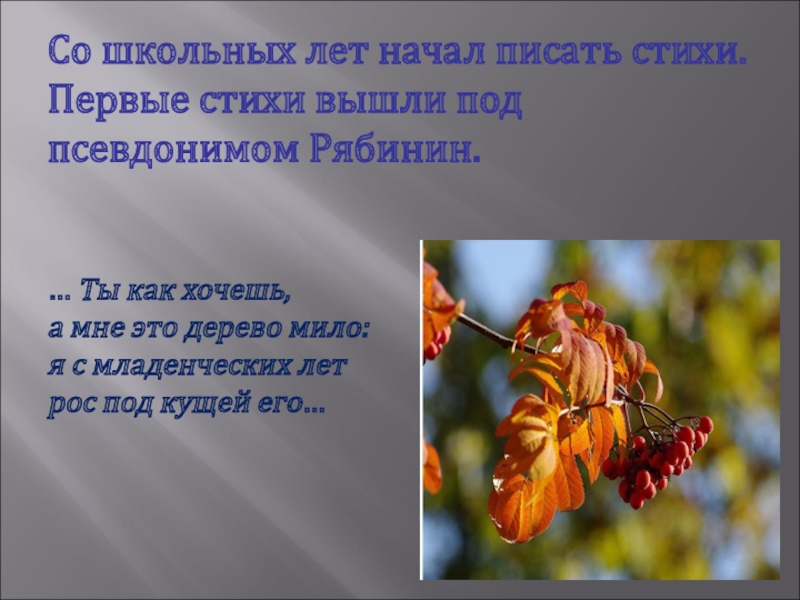 Слайд 4 Со школьных лет начал писать стихи. Первые стихи вышли под псевдонимом Рябинин.