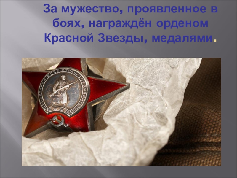 Слайд 7За мужество, проявленное в боях, награждён орденом Красной Звезды, медалями.