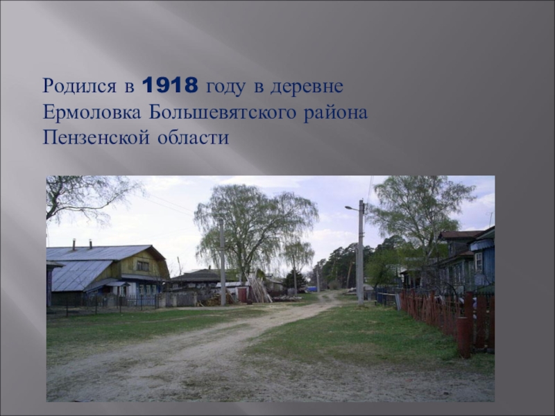 Слайд 3Родился в 1918 году в деревне Ермоловка Большевятского района Пензенской области