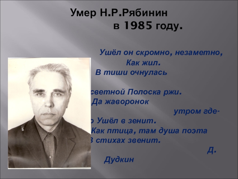 Умер Н.Р.Рябинин в 1985 году. Ушёл он скромно, незаметно, Как жил. В тиши очнулась предрассветной Полоска ржи. Да жаворонок утром где-то Ушёл в зенит. Как птица, там душа поэта В стихах звенит. Д.Дудкин