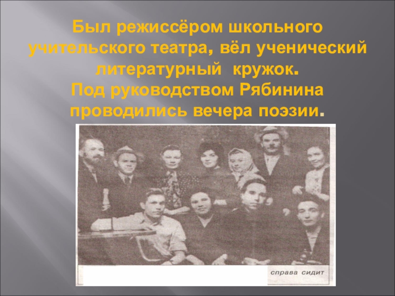 Слайд 10 Был режиссёром школьного учительского театра, вёл ученический литературный кружок. Под руководством