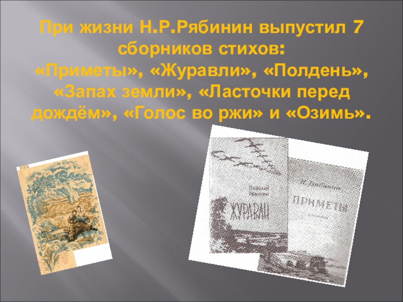 Слайд 12 При жизни Н.Р.Рябинин выпустил 7 сборников стихов: «Приметы», «Журавли», «Полдень», «Запах земли»,