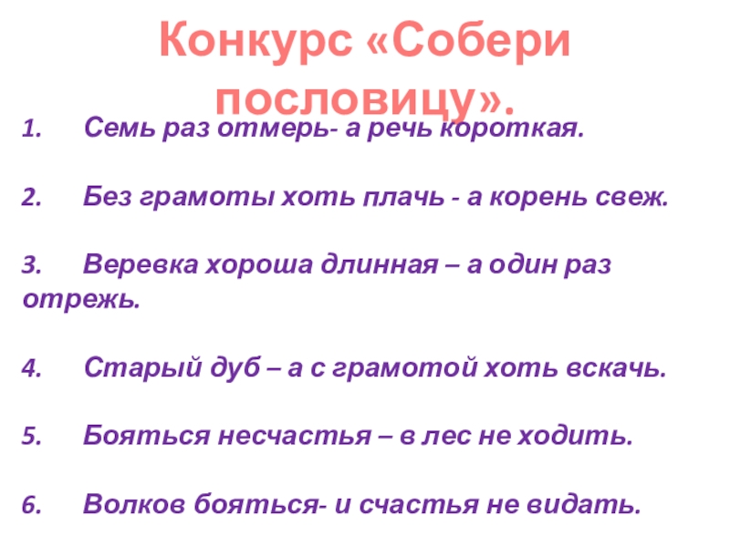 Конкурс «Собери пословицу». 1.   Семь раз отмерь- а речь короткая.2.   Без грамоты хоть