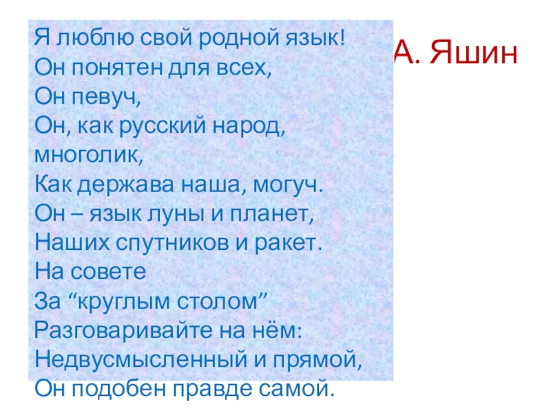 А. ЯшинЯ люблю свой родной язык!Он понятен для всех,Он певуч,Он, как русский народ, многолик,Как держава наша, могуч.Он – язык луны и планет,Наших спутников и ракет.На советеЗа “круглым столом”Разговаривайте на нём:Недвусмысленный и прямой,Он подобен правде самой.