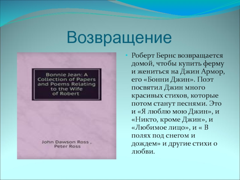 ВозвращениеРоберт Бернс возвращается домой, чтобы купить ферму и жениться на Джин Армор, его «Бонни Джин». Поэт посвятил