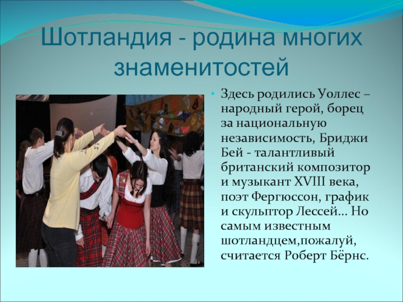 Шотландия - родина многих знаменитостейЗдесь родились Уоллес – народный герой, борец за национальную независимость, Бриджи Бей -