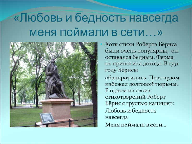 Слайд 13«Любовь и бедность навсегда меня поймали в сети…»
