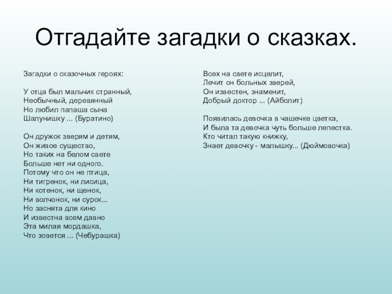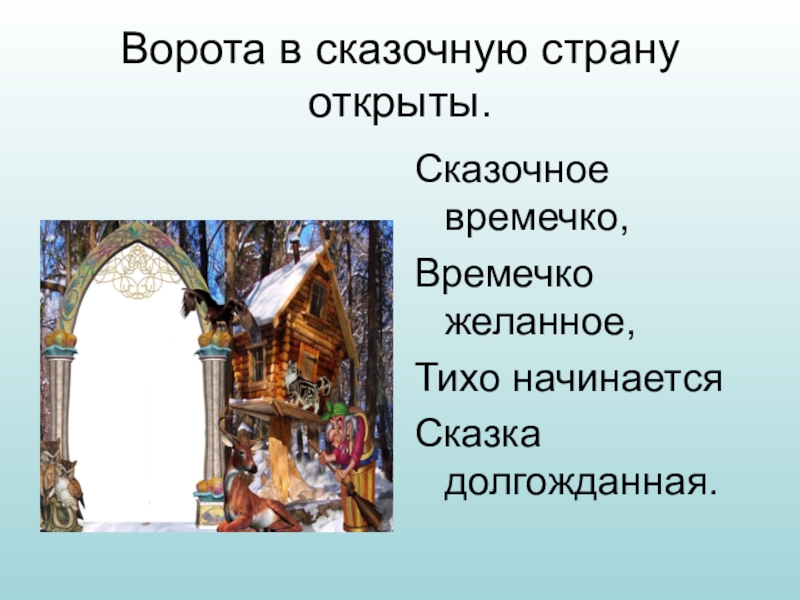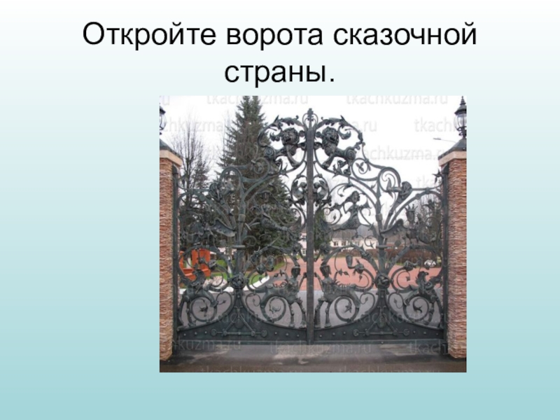 Слайд 10Откройте ворота сказочной страны. Отгадайте, какие это сказки.