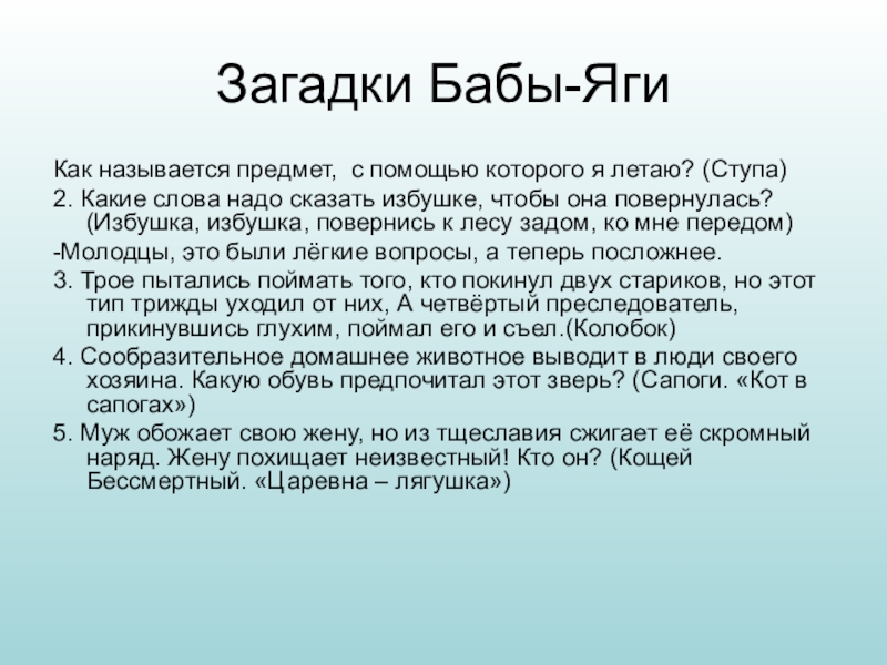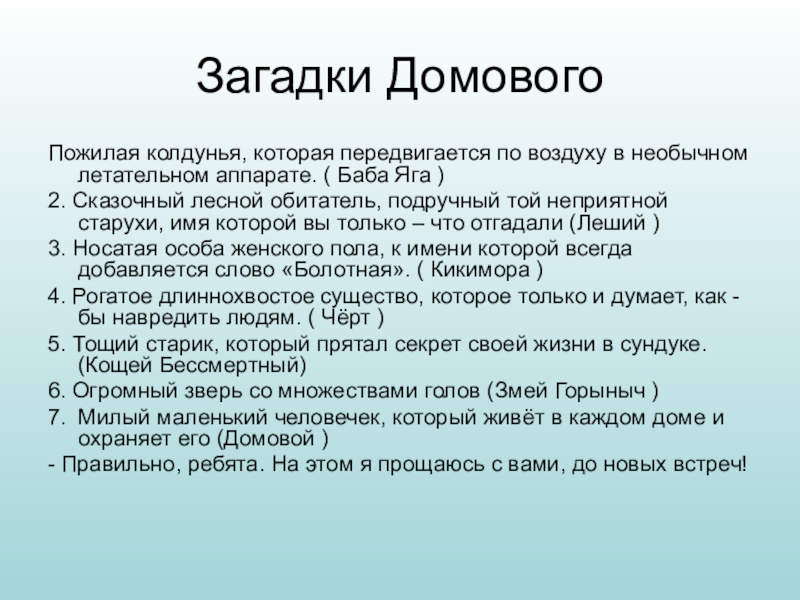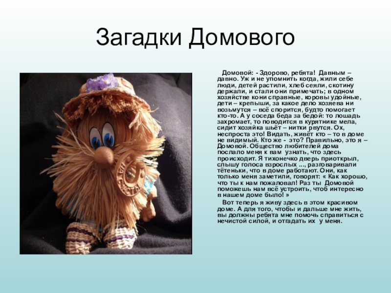 Вот теперь я живу здесь в этом красивом доме. А для того, чтобы и дальше мне жить, вы должны ребята мне помочь справиться с нечистой силой, и отгадать их у меня.
