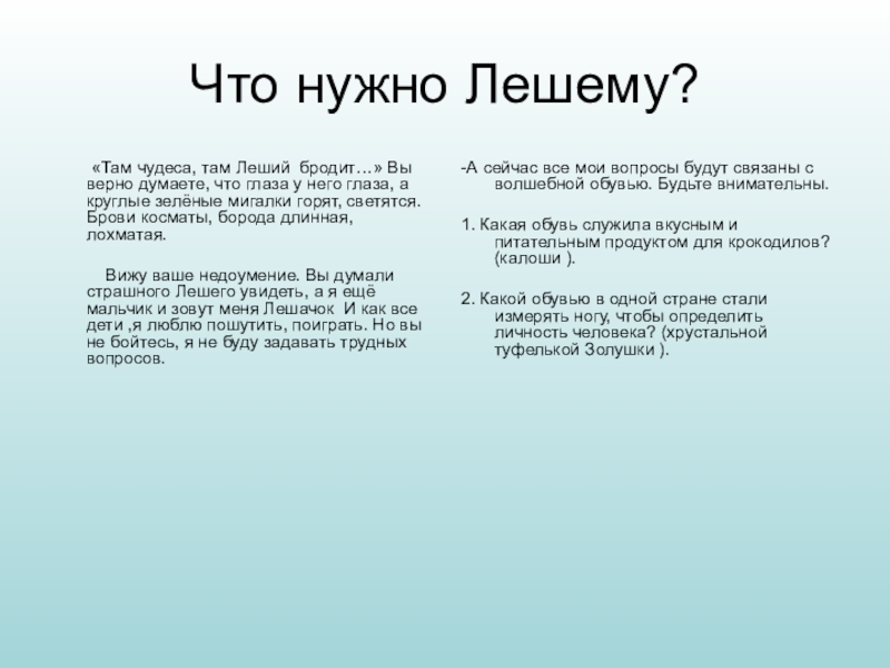 Вижу ваше недоумение. Вы думали страшного Лешего увидеть, а я ещё мальчик и зовут меня Лешачок И как все дети ,я люблю пошутить, поиграть. Но вы не бойтесь, я не буду задавать трудных вопросов.