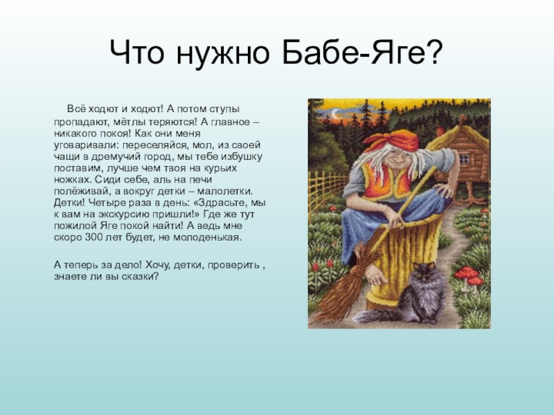 потом ступы пропадают, мётлы теряются! А главное – никакого покоя! Как они меня уговаривали: переселяйся, мол, из своей чащи в дремучий город, мы тебе избушку поставим, лучше чем твоя на курьих ножках. Сиди себе, аль на печи полёживай, а вокруг детки – малолетки. Детки! Четыре раза в день: «Здрасьте, мы к вам на экскурсию пришли!» Где же тут пожилой Яге покой найти! А ведь мне скоро 300 лет будет, не молоденькая.