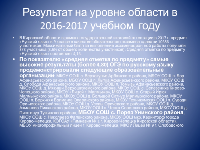 По показателю «средняя отметка по предмету» самые высокие результаты (более 4,80) ОГЭ по русскому языку продемонстрировали следующие образовательные организации: МКОУ ООШ с. Верхотулье Арбажского района, МБОУ СОШ п. Бор Афанасьевского района, МБОУ ООШ п. Лытка Афанасьев-ского района, МКОУ ООШ д. Слобода Афанасьевского района, МКОУ ООШ п. Томызь Афанасьевского района, МКОУ ООШ д. Мякиши Верхошижемского района, МКОУ СОШ с. Селезениха Кирово-Чепецкого района, МКОУ «Лицей г. Малмыжа», МКОУ СОШ с. Старый Ирюк Малмыжского района, МКОУ ООШ д. Большой Сатнур Малмыжского района, МКОУ ООШ п. Верх-няя Волманга Опаринского района, МКОУ Техникумская ООШ п. Суводи Ори-чевского района, МКОУ ООШ д. Усовы Оричевского района, МКОУ ООШ д. Ахманово Пижанского района, МКОУ ООШ д. Челка Советского района, МКОУ ООШ д. Пиштенур Тужинскогорайона, МБОУ СОШ с. Порез Унинского района, МКОУ ООШ с. Николаево Фаленского района, МКОУ ООШ мкр. Каринторф города Кирово-Чепецка, КОГОАУ «Гимназия № 1 г. Кирово-Чепецка Кировской области», МБОУ многопрофильный лицей г. Кирово-Чепецка, МКОУ Лицей № 9 г. Слободского