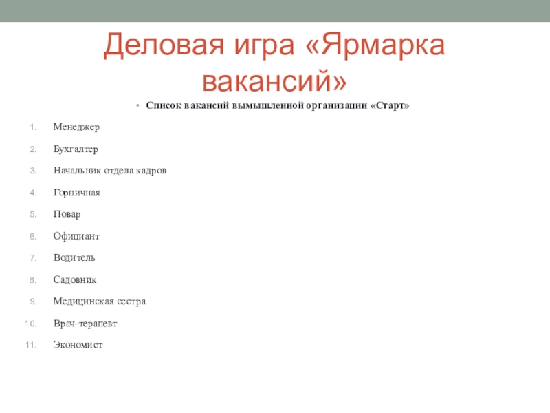 Деловая игра «Ярмарка вакансий»Список вакансий вымышленной организации «Старт»МенеджерБухгалтерНачальник отдела кадровГорничнаяПоварОфициантВодительСадовникМедицинская сестраВрач-терапевтЭкономист