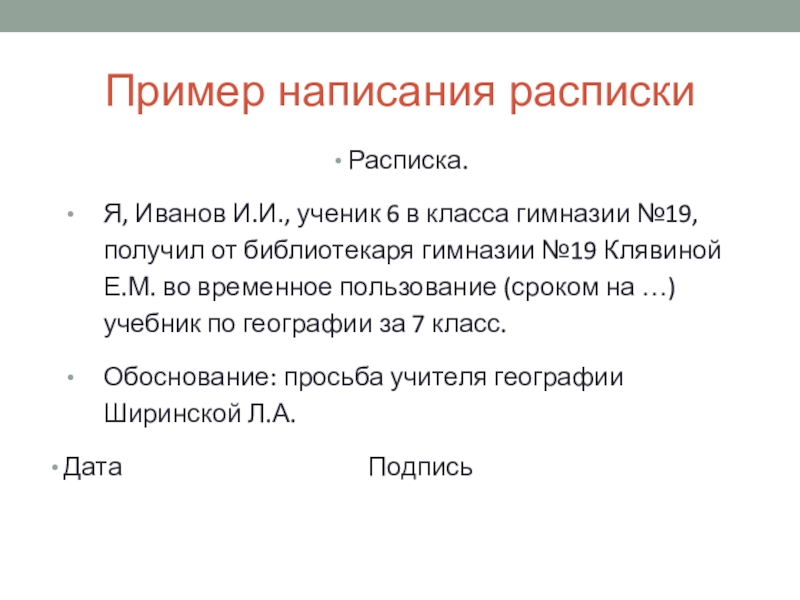 Пример написания распискиРасписка.Я, Иванов И.И., ученик 6 в класса гимназии №19, получил от библиотекаря гимназии №19 Клявиной