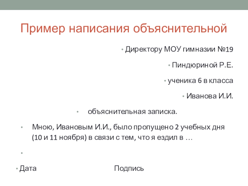Пример написания объяснительнойДиректору МОУ гимназии №19Пиндюриной Р.Е.ученика 6 в класса Иванова И.И.объяснительная записка.Мною, Ивановым И.И., было пропущено