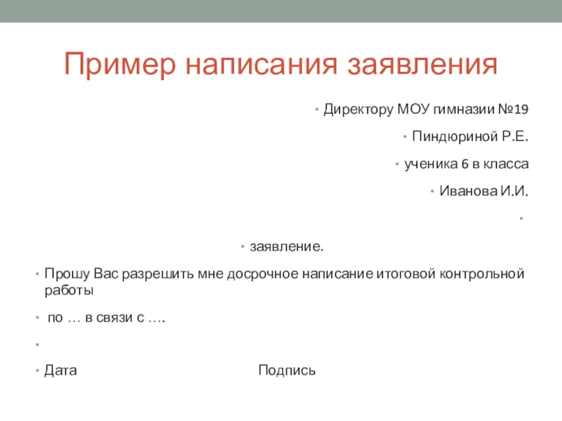 Пример написания заявленияДиректору МОУ гимназии №19Пиндюриной Р.Е.ученика 6 в класса Иванова И.И. заявление.Прошу Вас разрешить мне досрочное написание итоговой контрольной работы по … в связи с …. Дата Подпись
