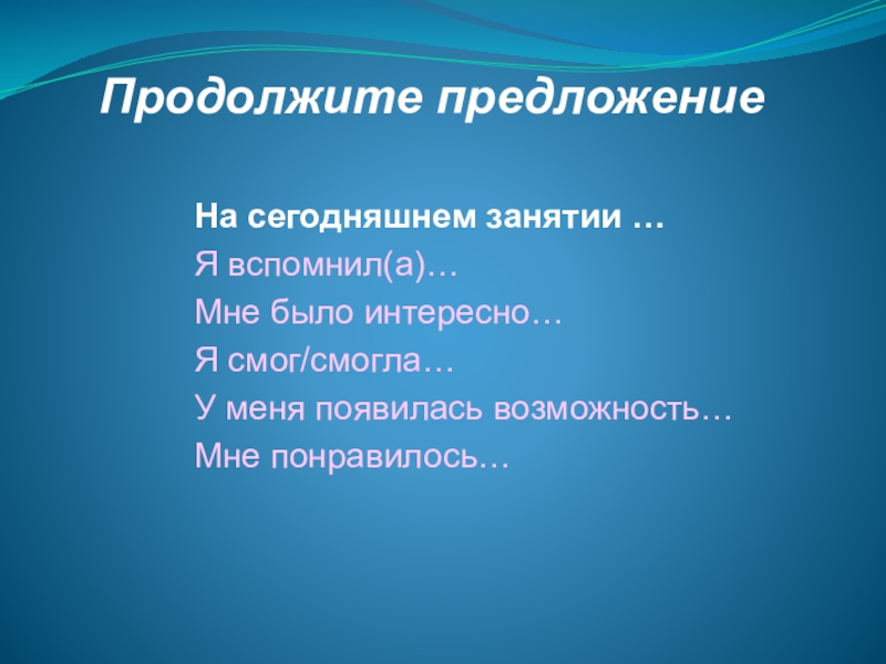 Продолжите предложениеНа сегодняшнем занятии …Я вспомнил(а)…Мне было интересно…Я смог/смогла…У меня появилась возможность…Мне понравилось…