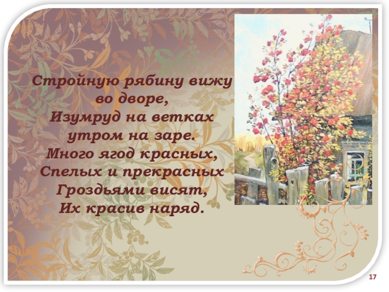 Слайд 17Стройную рябину вижу во дворе,