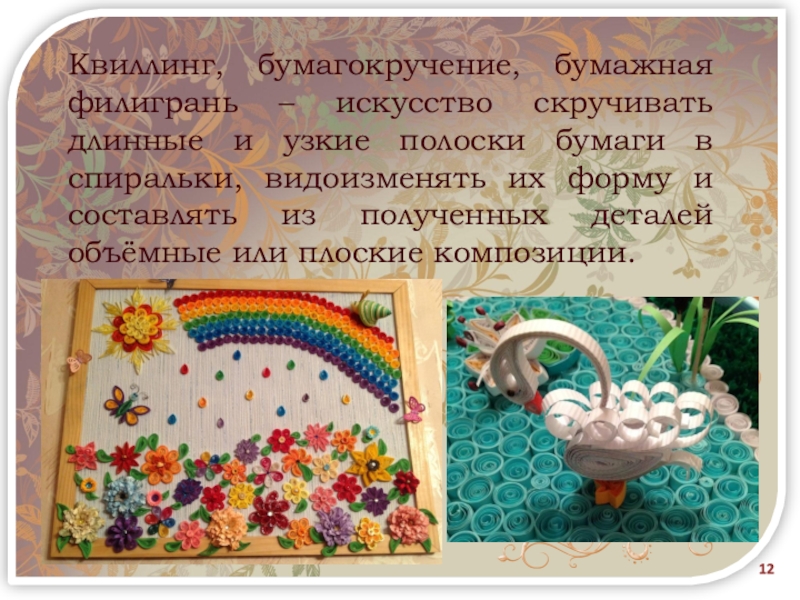 Слайд 12Квиллинг, бумагокручение, бумажная филигрань – искусство скручивать длинные и узкие полоски