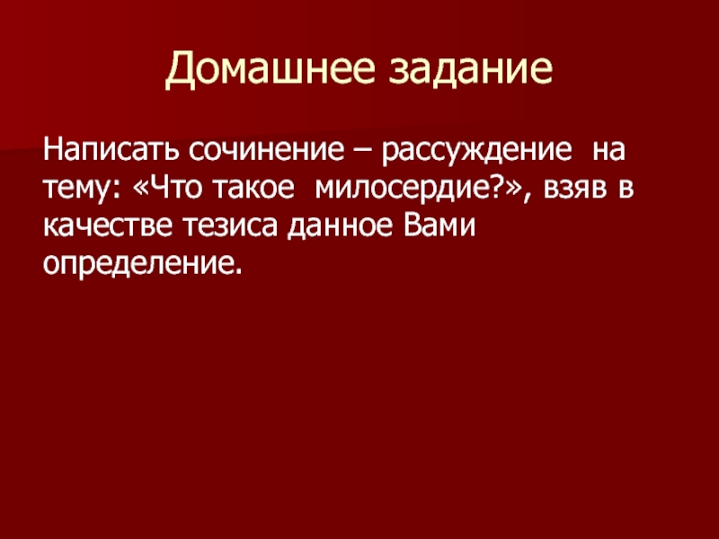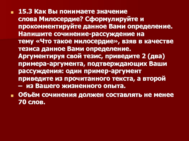 определение. Напишите сочинение-рассуждение на тему «Что такое милосердие», взяв в качестве тезиса данное Вами определение. Аргументируя свой тезис, приведите 2 (два) примера-аргумента, подтверждающих Ваши рассуждения: один пример-аргумент приведите из прочитанного текста, а второй – из Вашего жизненного опыта.